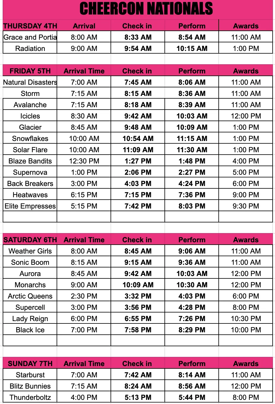 Each team has their own specific arrival time. It is really important that you arrive on time, as this is when the team runs through their routines and prepares with their coach before heading backstage. We will post the meeting spot on Band, so please make sure you are on the app. All students need to come with full hair and makeup, dressed in their costume with their NRG Nationals T-shirt or Jacket on.